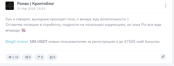 Автор регулярно дает реферальную ссылку на криптобиржу BingX, но при этом не ведет статистику, не подключает копитрейдинг, чтобы пользователи могли увидеть его результаты.