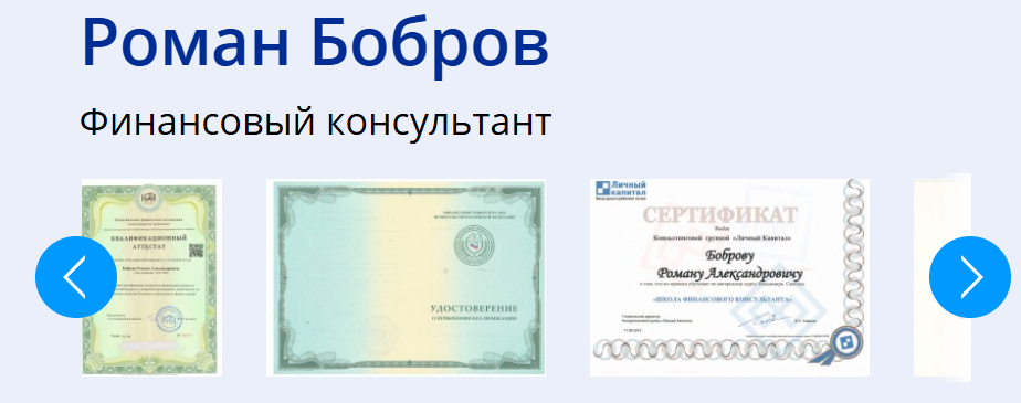 В краткой биографии на сайте онлайн-школы Lkapital ru действительно есть скрины сертификатов и аттестатов о дополнительном образовании. При этом пользователи не могут их проверить на подлинность.