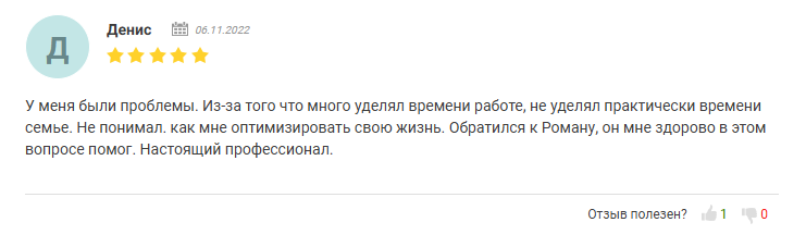 Денис воспользовался услугами Романа Боброва и у пользователя получилось оптимизировать свою жизнь, найти баланс между семьей и работой.