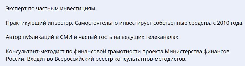 Роман пишет, что является экспертом в частных инвестициях и вкладывает собственные деньги в инструменты с 2010 года. Также его пригласили в Министерство финансов России на должность консультанта-методиста по финансовой грамотности. При этом никаких доказательств профессиональной деятельности он аудитории не показывает.