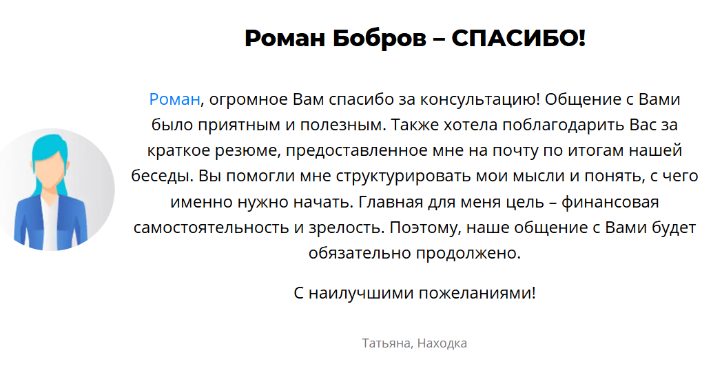 Татьяна также благодарит наставника за полезный контент и приятное общение. Роман помог ей структурировать свои знания и мысли в сфере финансовой грамотности.
