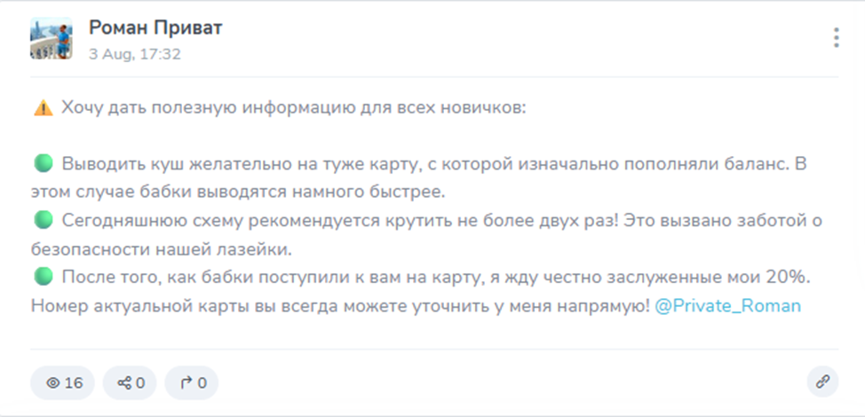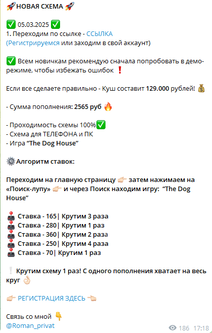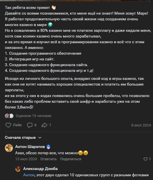 Автор предлагает пользователям зарабатывать на взломах онлайн-казино. Якобы он анализирует уязвимости и сообщает об этом своим подписчикам. При этом легенда максимально неправдоподобная: платформы с азартными играми не станут работать себе в убыток, все возможные поломки быстро устраняются, а подозрительные операции – блокируются. Да и даже если принять во внимание небылицу про то, что Роман якобы внедрил некий код для взлома в ПО, маловероятно, что эту неполадку так и не устранили спустя много месяцев.