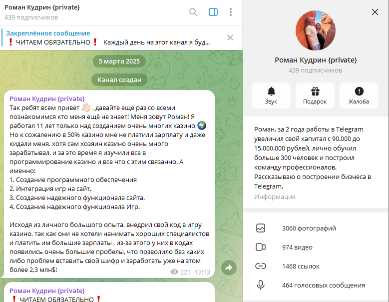 Роман Кудрин private – Телеграм-канал, созданный человеком, позиционирующим себя в качестве эксперта в онлайн-казино. Автор утверждает, что отлично разбирается в ПО и даже работал на несколько площадок, но из-за того, что его регулярно обманывали с зарплатой он стал делать системы более уязвимыми ко взломам. При этом Роман Кудрин Тг отзывы получил в основном негативные. Узнаем, безопасно ли сотрудничать с автором.