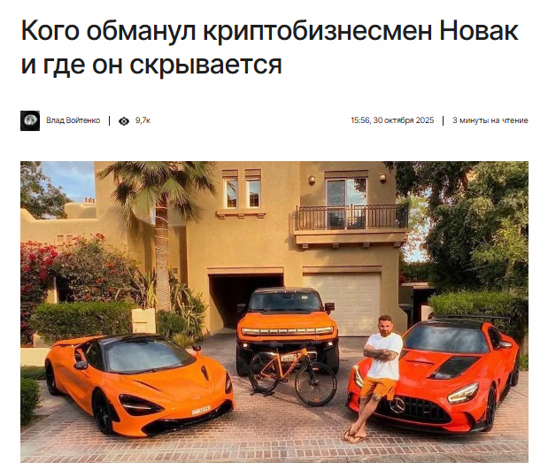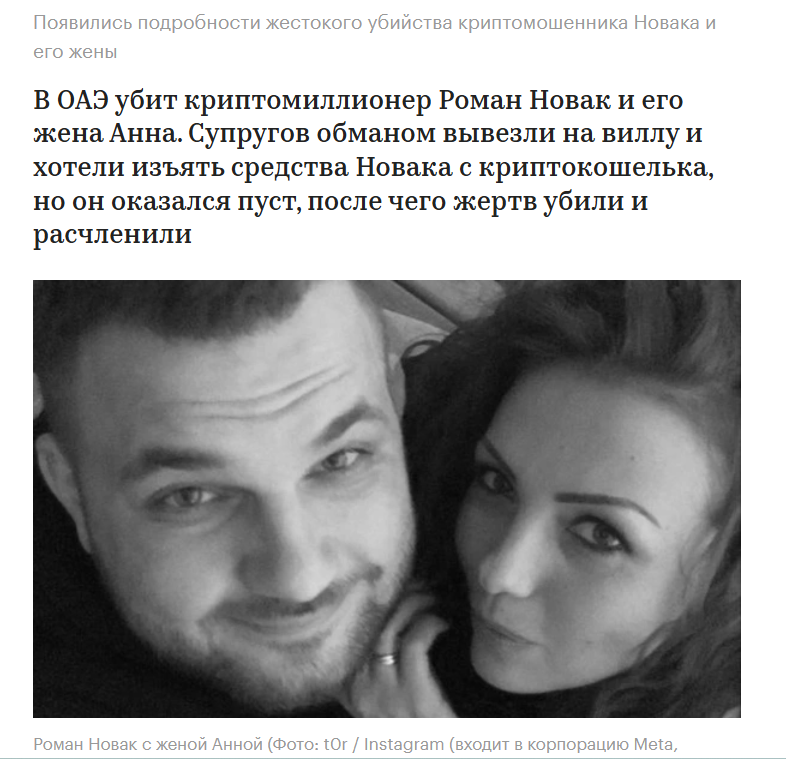 На начало ноября 2025 стало известно что случилось с крипто мошенником Романом Новак. Крипто аферист и его супруга Анна были убиты. Исполнителями убийства оказались граждане РФ. Однако некоторые публикации выдают другую информацию – трагические события с семейной парой могут быть инсценировкой для исчезновения жулика.