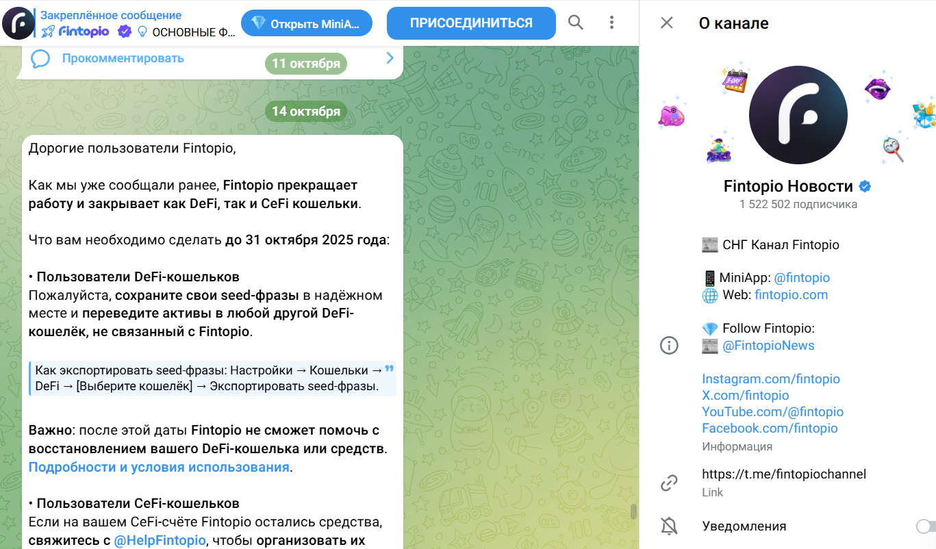 На момент написания, когда новости про махинации и обман Романа Новака облетели все СМИ, Телеграм канал @ fintopiochannel сообщил о сворачивании проекта. Сообщение в Telegram опубликовано 14 октября 2025 года.