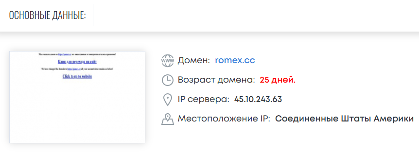 По состоянию на середину ноября 2025 года домен платформы существует всего 25 дней. URL зарегистрирован в Соединенных Штатах, что не внушает доверия к проекту. На момент проведения проверки платформа Romex Cc недоступна на территории России.