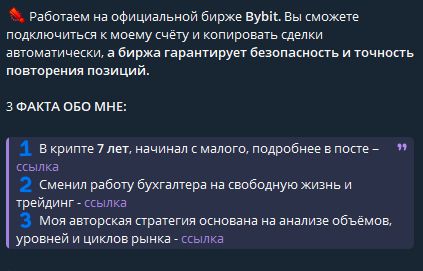 Торговля ведется на официальной бирже Bybit. Однако, все сотрудничество происходит не напрямую с трейдером Yacht Financier, а через посредников – Илью Николаевича Котова (Kotov BB) и Aleksandr Krivitskiy (AlexTrade009).
