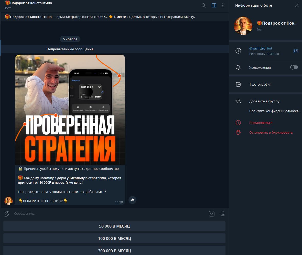Помимо основного канала, используется бот «Подарок от Константина» (yachttrd bot).