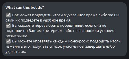 Сервис предназначен для организации розыгрышей и конкурсов среди подписчиков различных проектов. Он регистрирует участников и выбирает победителей с помощью генератора случайных чисел. Весь функционал завязан на проведении раздач с рандомными победителями в группах, чатах и каналах.