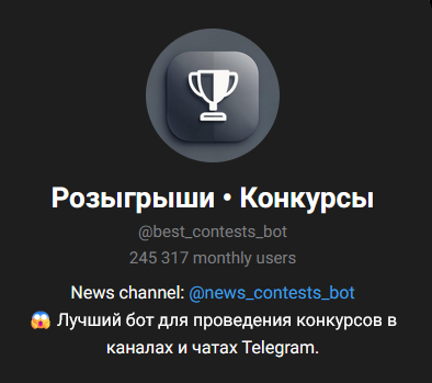 Best Contests Bot в ТГ использует порядка 250 тысяч пользователей ежемесячно. Это официальная статистика, отображаемая самим мессенджером. Конечно, показатель тоже могут накрутить, но на это ничего не указывает.