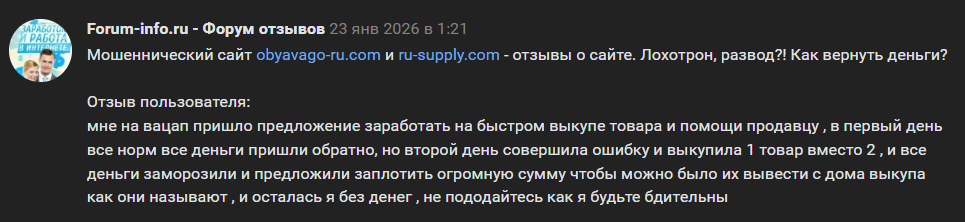 По состоянию на 04.02.2026, на просторах Интернета можно обнаружить пока не много отзывов о сайте Ru Supply com, но, что характерно, они все негативные. Люди сообщают, что после регистрации на площадке и указания там своего номера телефона, им на WhatsApp писали представители проекта и предлагали заработать на быстром выкупе товара. По данным одного из комментаторов, ему выплатили средства с процентом прибыли в первый день, но далее уже не дали вывести никакие деньги из площадки.