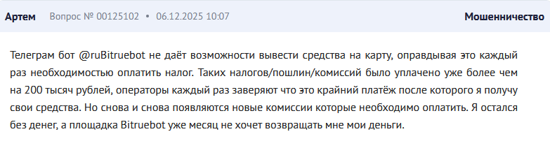 На разных сайтах в своих отзывах на ruBitruebot люди пишут, что проблем с внесением депозита не возникает. Однако при попытке вывести деньги появляются требования дополнительных оплат комиссий, штрафов, налогов и прочего.