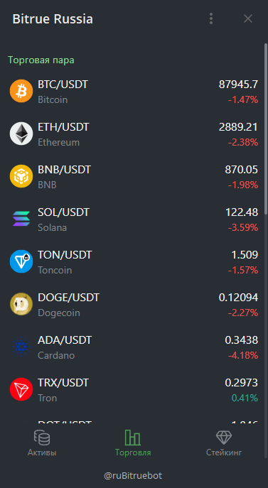 Сам бот используется в основном для запуска мини-приложения с торговым терминалом, в нем самом функций нет. Ru Bitrue bot запускается в отдельном окне, где можно:
