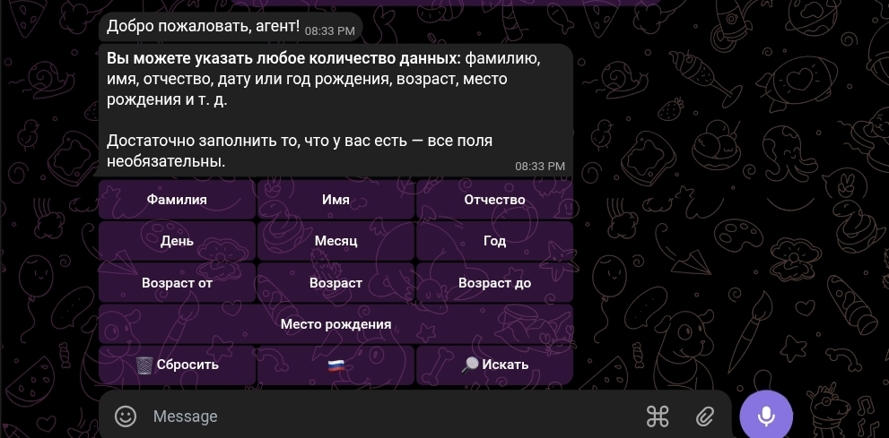 После запуска бота через команду /start новый пользователь получает приветствие «Добро пожаловать, агент» и форму поиска с полями: фамилия, имя, отчество, дата рождения, возраст, место рождения. Все поля необязательны — достаточно любого фрагмента данных.