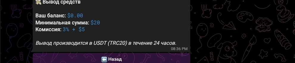 Вывод средств производится исключительно в USDT по стандарту TRC20. Минимальная сумма — $20, комиссия — 3% плюс фиксированные $5. Ни одна легальная платформа не выводит заработок пользователей в анонимной криптовалюте без идентификации получателя. Это типичная схема для сервисов, которые намеренно исключают прослеживаемость денежных потоков.