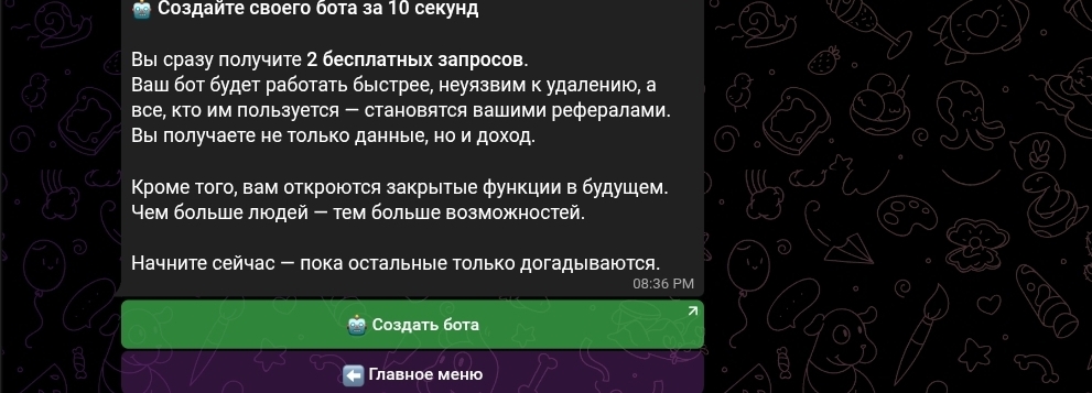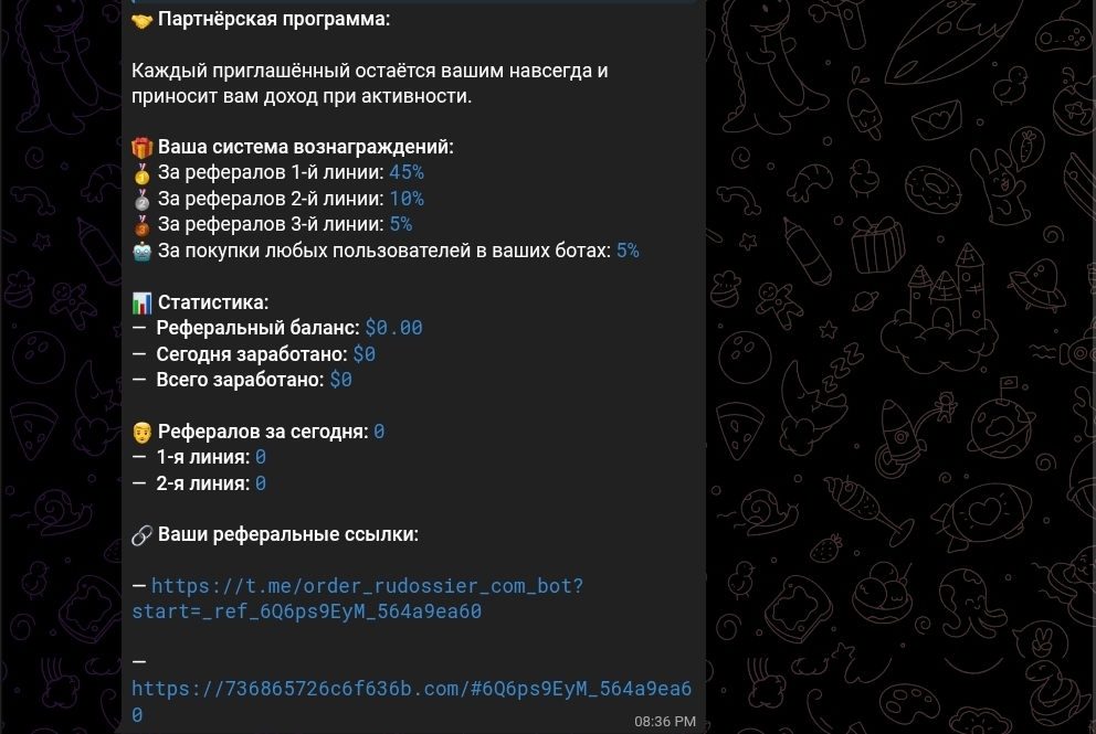 Фраза «в ваших ботах» отсылает к отдельной функции — «конструктору ботов». Каждый пользователь может создать собственного бота-пробивки на базе Rudossier буквально за 10 секунд и привязать к нему собственную реферальную ссылку. Те, кто придёт через этот бот, становятся рефералами создателя и приносят ему процент автоматически. Это не просто реферальная программа — это сеть по распространению инструмента для незаконного пробива данных, где каждый участник одновременно является и клиентом, и дистрибьютором.