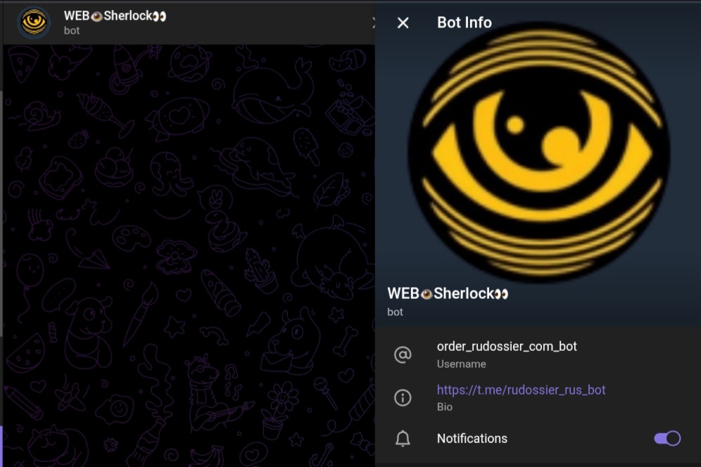 Проект работает через два бота: Order Rudossier com bot и Rudossier rus bot. Оба связаны с аккаунтом Hudsonlab (Mrs. Hudson). Бот представлен как «личный помощник-детектив, объединяющий передовые технологии информационной безопасности и искусство OSINT-разведки». Логотип — стилизованный глаз в виде спирали, нейминг подчеркнуто детективный.