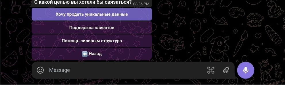 В разделе «Связаться с нами» бот предлагает три варианта обращения: поддержка клиентов, помощь силовым структурам и — отдельной кнопкой — «хочу продать уникальные данные». Это прямое предложение покупать у пользователей персональные данные третьих лиц. Иными словами, Rudossier телеграм не только продает доступ к чужой информации, но и активно формирует предложение — скупая данные у тех, кто имеет к ним доступ незаконным путем. Именно так работает рынок слитых баз: одни крадут, другие покупают, третьи перепродают через удобный бот-интерфейс.