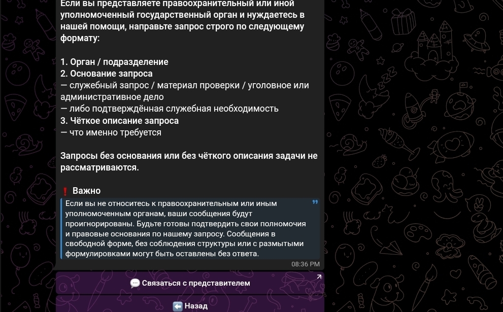 Ещё одна деталь — отдельный раздел поддержки для правоохранительных органов. Бот предлагает сотрудничество, но оговаривает: запросы принимаются только строго по формату с указанием органа, подразделения, основания и описания задачи. «Запросы без основания не рассматриваются». Этот раздел создаёт видимость легитимного инструмента для следственной деятельности. Но реальные правоохранительные органы не пользуются анонимными Telegram-ботами для запросов персональных данных — у них есть официальные процедуры взаимодействия с операторами данных.