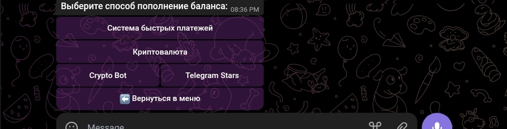 Пополнение баланса в боте Ru dossier тг доступно через несколько каналов: систему быстрых платежей (СБП), криптовалюту, Crypto Bot и Telegram Stars. Выбор именно этих инструментов — не случайность. СБП позволяет переводить без указания реквизитов юридического лица, а криптовалюта и вовсе исключает идентификацию получателя.