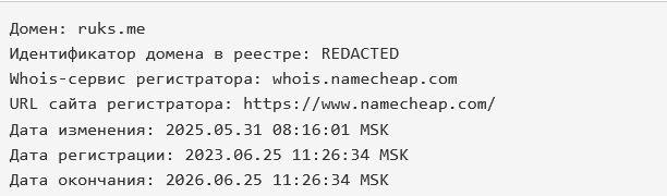 На сайте есть раздел «О компании», но юридической информации здесь не размещено. После проверки домена сервисом Whois, выяснилось, что сайт запустили в июне 2023 года, в мае 2025 года обновили, оплата ruks me проведена только на год.