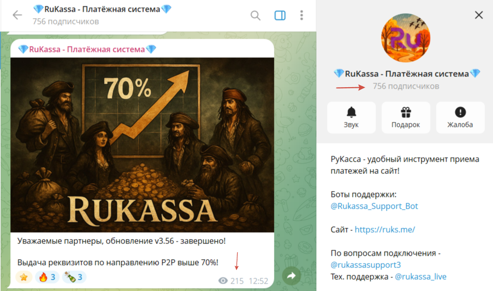 У платформы есть инфоканал в Телеграмм, где публикуются новости развития ресурса, а также информация о доступных обновлениях, технических работах. На сообщество подписаны 756 человек, активность аудитории средняя.