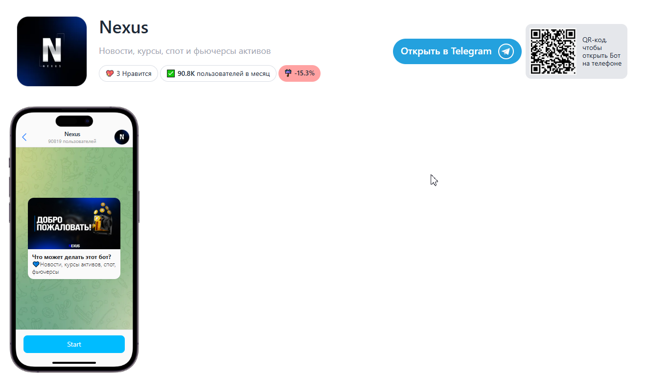 Основная функция «Нексус бот» в ТГ — это демонстрация ситуации на рынке. В программе собраны последние новости, актуальная стоимость цифровых валют, развития рынка фьючерсов и спота. Все это трейдеры могут наблюдать в одном приложении.
