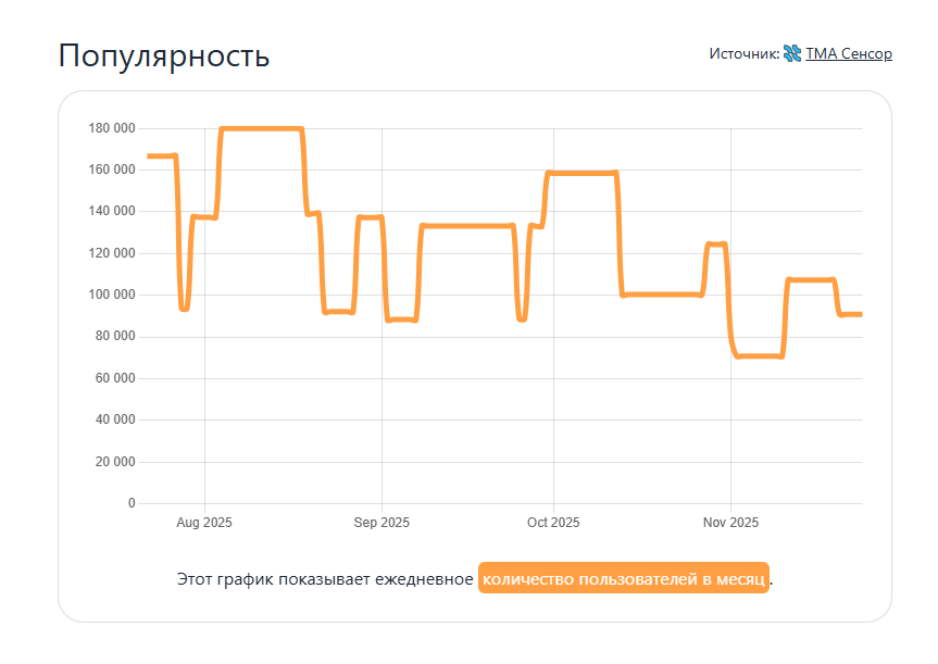 Разумеется, никаких гарантий безопасности разработчики телеграм-бота пользователям не предлагают. Такие мини-приложения традиционно функционируют полностью анонимно. Ботом пользуется в настоящий момент 90 тысяч пользователей ежемесячно. Неизвестно, реальная ли это цифра, поскольку никаких сведений о программе в сети не представлено. Официальная статистика показывает, что популярность приложения резко упала за последние пару месяцев.