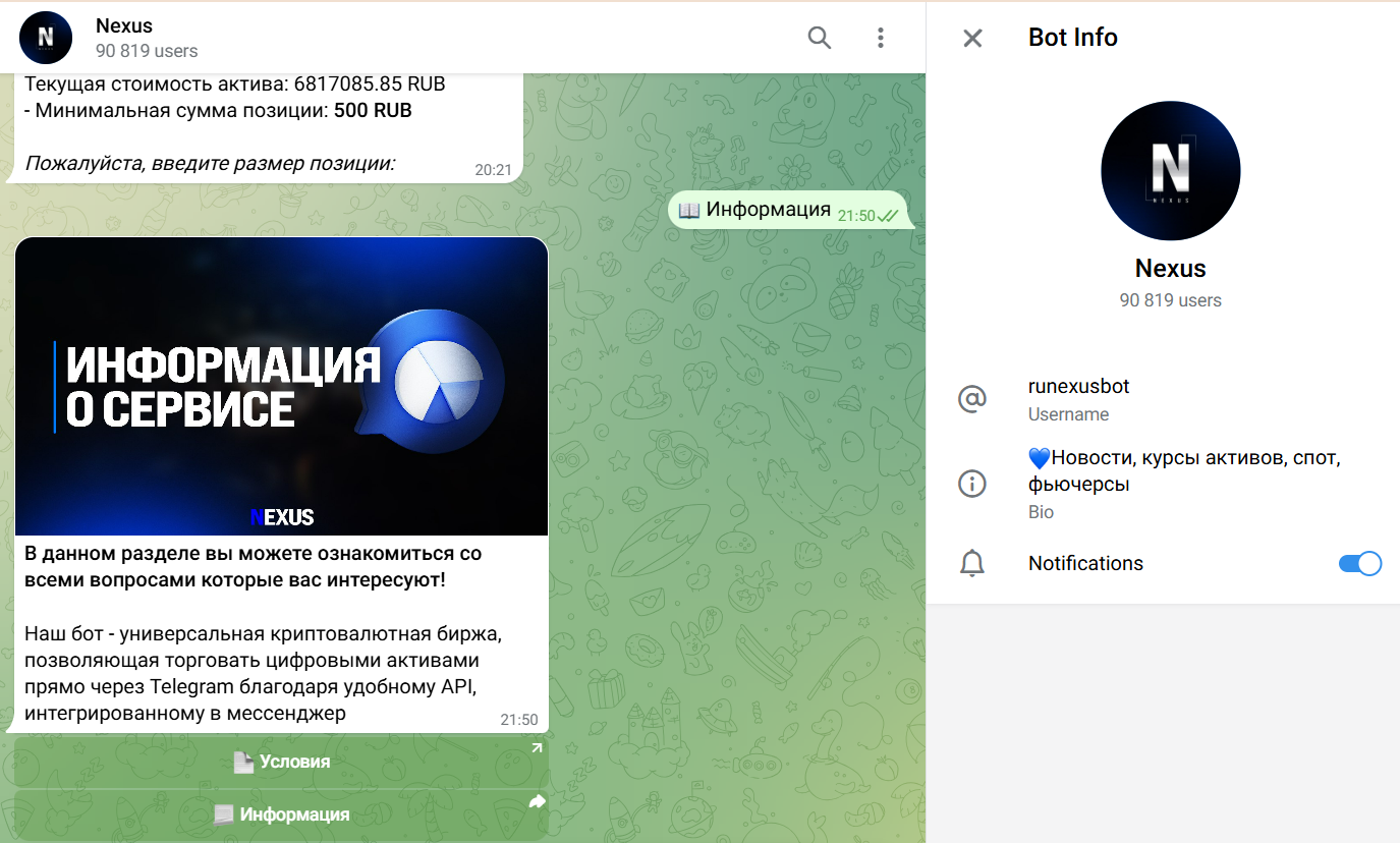 Интерфейс «Нексус бота» в Телеграм дает возможность настроить его в соответствии с собственными интересами. Разработчики своей главной цель видели создание возможности для оперативного доступа к сведениям.