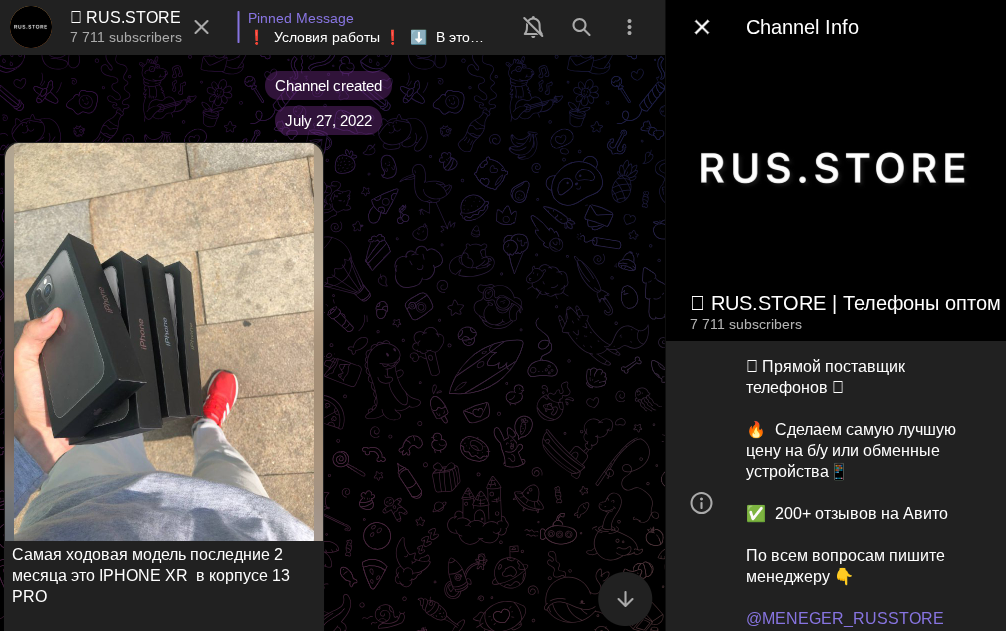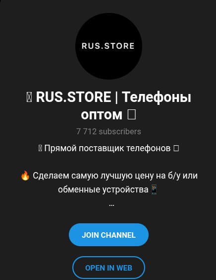 В описании цифрового маркетплейса на базе телеграм-канала Rus Store разработчики указывают, что их магазин является прямым поставщиком телефонов. Кроме этого, каждому клиенту Менеджер RUS STORE подбирает индивидуальный прайс-лист и делает лучшую стоимость на б/у или обменные устройства. Вдобавок к обещанию, команда пишет про более 200 отзывов на «Авито», но ссылку на ветку не прикрепляет.