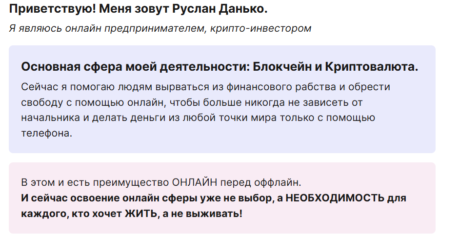 Данько пишет, что интересуется криптой и блокчейном, потому что видит их преимущество перед офлайн-торговлей. Клиентов Руслан хочет научиться, как жить, а не выживать, благодаря онлайн-сфере, чтобы ни от кого не зависеть.