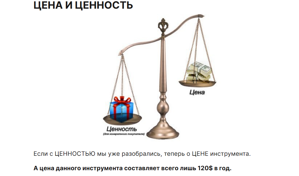 Трейдер предлагает некий платный инструмент для торговли своим ученикам и данный инструмент для трейдинга якобы очень ценный. Участники покупают его по цене $120 за год доступа к функционалу.