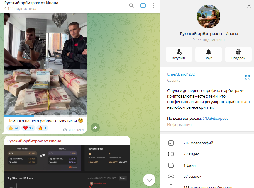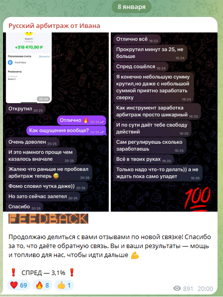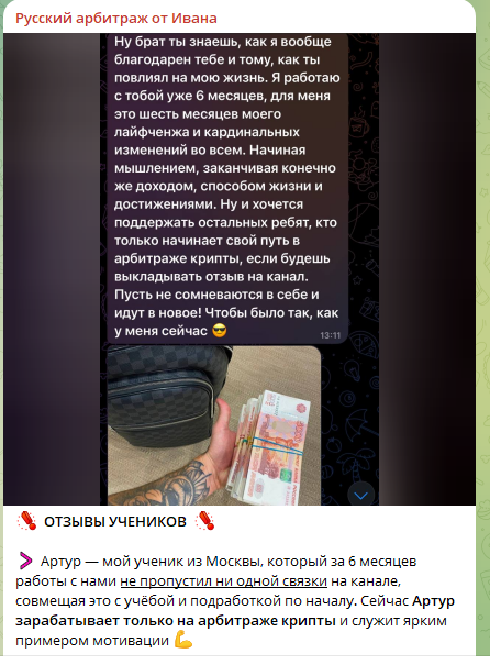 Телеграм‑канал «Русский арбитраж от Ивана» привлекает внимание криптанов обещаниями лёгкого заработка. Якобы он помогает сделать профит на криптоарбитраже за счет приватных уроков. На первый взгляд всё подано в привычном для множества каналов стиле. Есть яркие скриншоты, истории успеха и приглашение в закрытый формат. Но если снять розовые очки и посмотреть повнимательнее, то картина становится менее привлекательной.