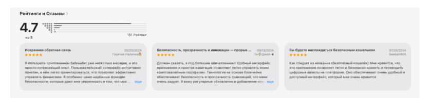 В целом SafeWallet получает положительные оценки. Пользователи хвалят понятный интерфейс, стабильную работу и надежное хранение активов. Отдельно отмечают некастодиальную модель – приватные ключи остаются у владельца и удобную интеграцию с DeFi. Плюсом считают и круглосуточную поддержку.