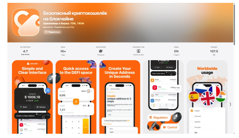 SafeWallet – удобный некастодиальный кошелек для iOS. Из сильных сторон: полный контроль над приватными ключами, поддержка популярных валют, интеграция с DeFi и круглосуточная поддержка. По отзывам, приложение работает стабильно и понятно в использовании.