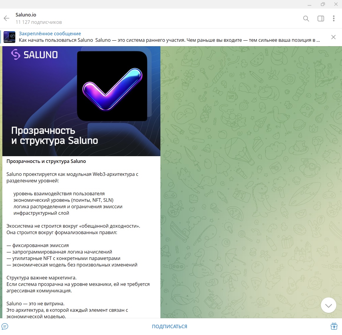 Telegram является центральным узлом всей экосистемы Saluna io. Именно здесь происходит основная коммуникация, прогрев аудитории и операционное управление сообществом. Проект не просто ведет информационную ленту, а выстраивает вокруг мессенджера полноценную воронку продаж и техническую поддержку.