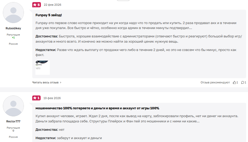 Мы приведем пару отзывов о funpay com. Они достаточно полярны, но позитивных примерно 70% от общего числа комментов об этом ресурсе.