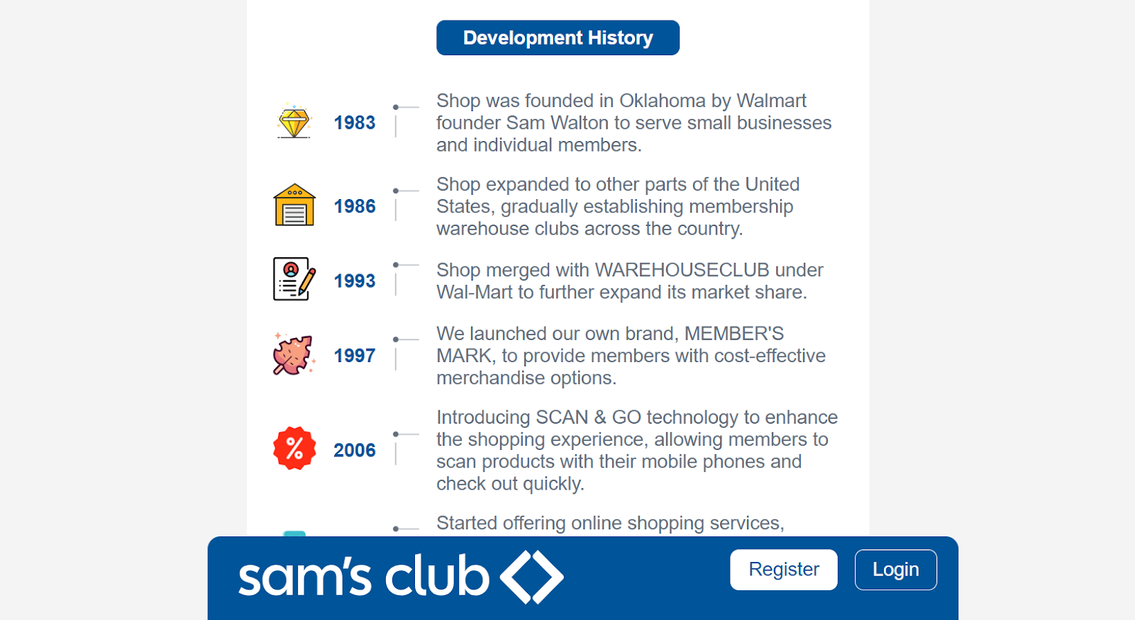 Samclub site выстраивает свою легенду так, будто за ним стоит настоящий гигант мировой розницы. Реальный Sam’s Club — настоящая американская сеть складов-клубов, работающая с 1983 г. и принадлежащая гиганту Walmart. Официально, легально и прозрачно: десятки миллионов клиентов, понятная структура и многолетняя репутация, которой можно доверять без сомнений.