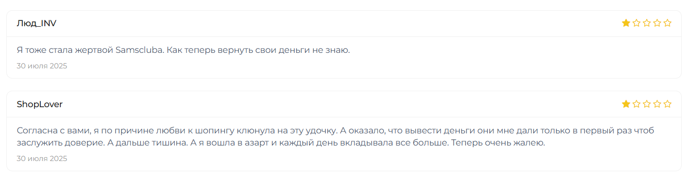 Платежные системы, комиссии, лимиты: все это тоже отсутствует у мошенников samscluba com. Это значит, что клиент не знает сколько будет стоить вывод и сколько ждать выплаты. А учитывая, что юридически никто за их деятельность не отвечает, перспектива вернуть средства в случае конфликта равна нулю.