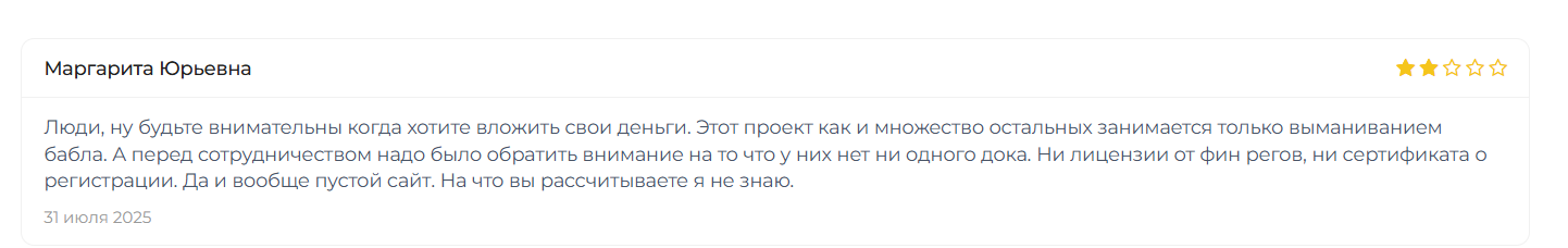 Люди рассказывают, что сайт пустой, документы отсутствуют, а вся “работа” строится вокруг внесения все больших сумм под предлогом высокой доходности.