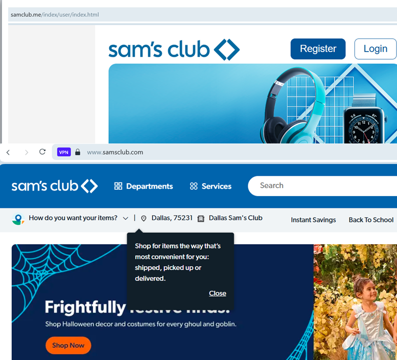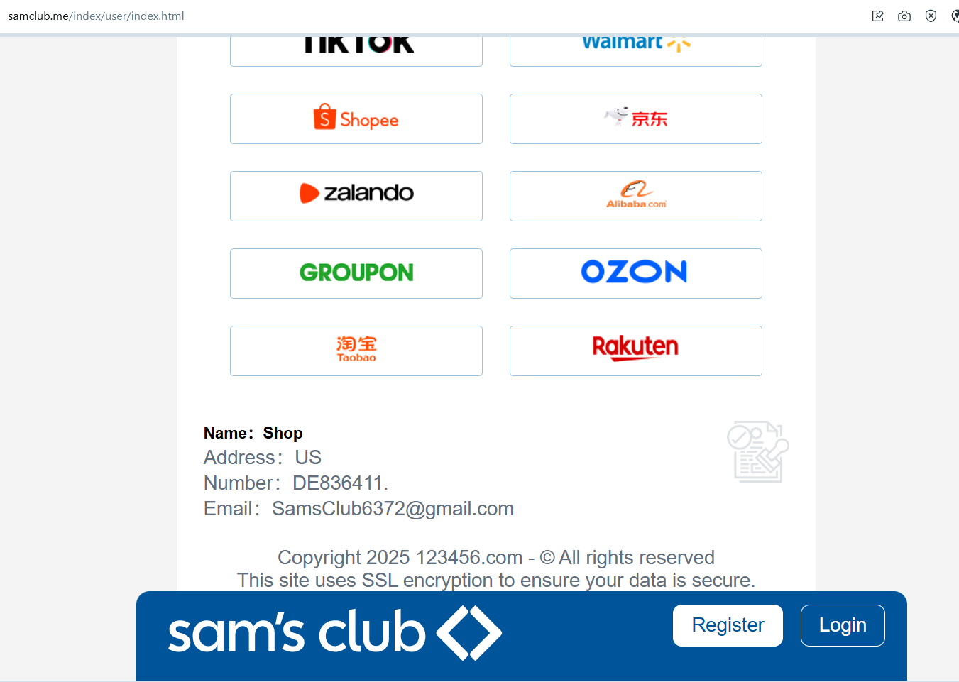 Сеть умело замаскировалась: одна буква в названии, копия логотипа, легенда о долгой истории и все, как у настоящего Sam’s Club. Разница в одной букве, и перед вами уже не американская сеть с 40-летней историей, а свежий домен, зарегистрированный два месяца тому назад без лицензий, адресов, реальных контактов, документов и юридической ответственности.