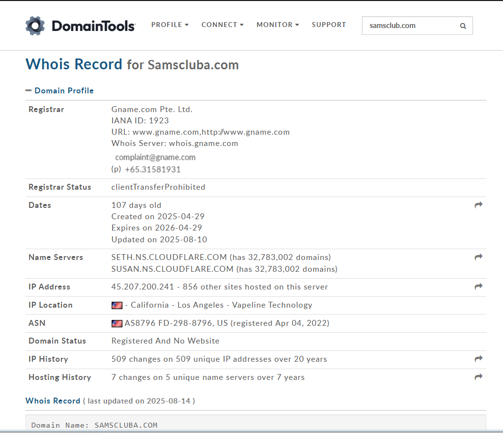 Вот только проблема в том, что домен компании зарегистрирован 29 апреля 2025 г., и юридически весь этот 40-летний опыт, выложенный на Samscluba com — развод.