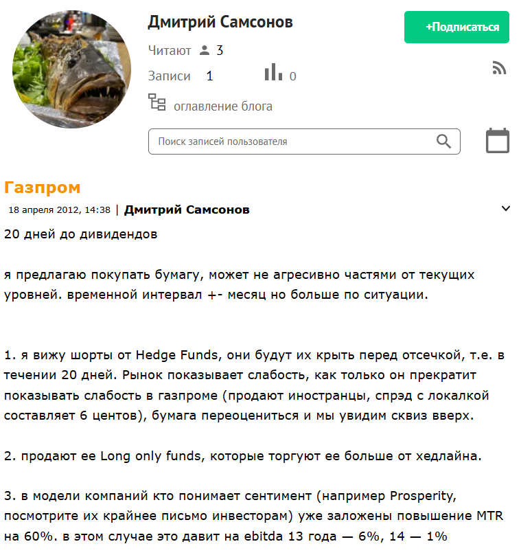 На инвесторском форуме мы также обнаружили одну публикацию некоего Дмитрия Самсонова, однако есть сомнения, что это один и тот же человек. Запись, на секунду, была сделана еще в 2012-м году, так что, скорее всего, перед нами просто тезка и однофамилец.