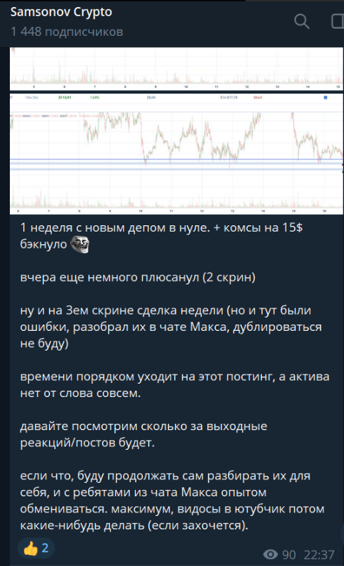 Содержание публикации тоже странное. Тут админ даже не пишет, какими активами торгует, просто рассказывает о результатах, причем довольно посредственных. За неделю торговли, например, он оказался в нуле.