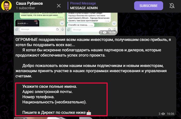 Телеграм Саши Рубанова про инвестиции имеет ссылку Rubanovaleks. Это канал с единственным подписчиком, созданный 4 июня 2025 года. Постов вышло пока очень немного, первая публикация взята из официального Ютуб Алекса как из проекта Финансовый Аудит. Затем без каких-либо объяснений началась реклама услуги раскрутки счета: скриншоты сделок, отзывы, скрины личных переписок с клиентами. Откуда они взялись, если канал только создан, не ясно. Был ряд постов, явно скопированных из Инстаграм и даже не отредактированных. Например, подписчикам предлагают собрать инвестиционный портфель и просят прислать личную информацию в Директ по ссылке, которой, разумеется, нет.