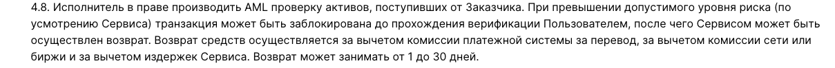 Конечно, грязную крипту никто не хочет менять. Но часто в Правилах указывают максимальный процент грязи, а также сайты, с которых не принимается криптовалюта. В случае этого же обменника средства могут задержать на срок до 30 дней фактически с любым риском.