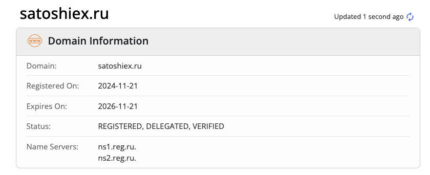Домен сайта satoshiex ru зарегистрирован в конце 2024 года.
