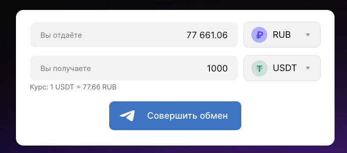 Но на самом сайте и в мини-приложении в Телеграм доступен только обмен ЮСДТ на рубли и в обратном направлении.