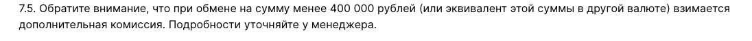 Во-вторых, стоит отметить и то, что при заказе обмена на сумму до 400 тысяч рублей взимаются дополнительные комиссии: