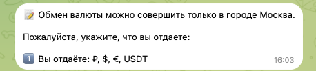 Что же касается обмена, что в боте говорится об обмене рублей, долларов, евро и USDT.